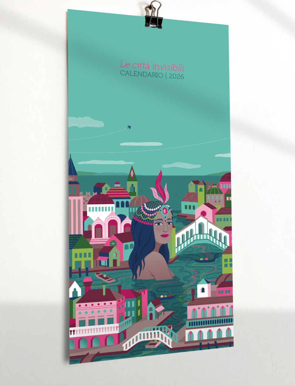 Una città invisibile per ogni mese. Un altro anno dedicato alle donne-città.Il calendario realizzato nel formato 15x30, è stampato fronte/retro e rilegato con una molletta metallica.Sarà pronto e spedito a dicembre .Un mese alla volta, il calendario prenderà vita grazie alla realtà aumentata, grazie al fantastico lavoro di Alkanoids.Basterà scaricare l'app gratuita Aria, inquadrare le immagini con lo smartphone e il calendario diventerà una piccola gallery di illustrazioni animate! Buona visione e buon 2026!